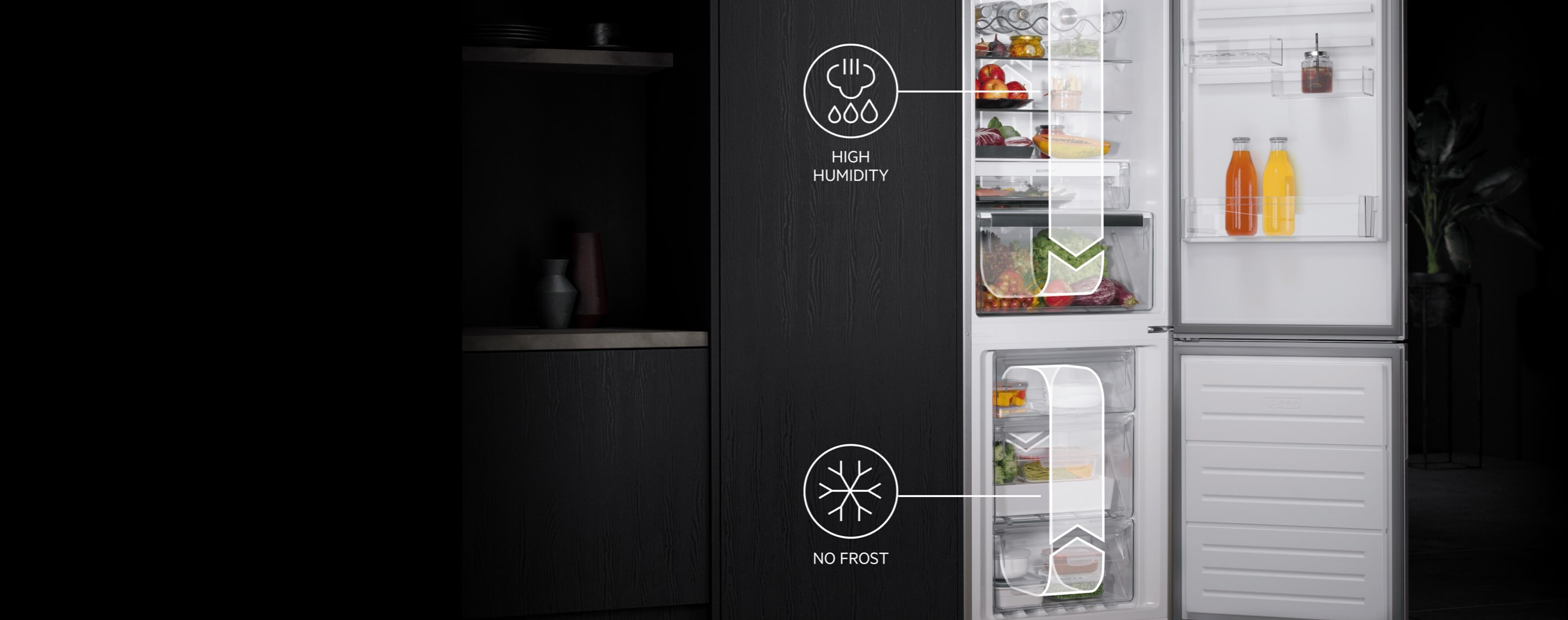 Η προηγμένη τεχνολογία διπλής ψύξης και η ανεξάρτητη κυκλοφορία αέρα διασφαλίζουν ότι ο καταψυγμένος ξηρός αέρας από τον καταψύκτη δεν χρησιμοποιείται για την ψύξη του ψυγείου, όπως γίνεται στα τυπικά ψυγεία που δεν διαθέτουν τεχνολογία No Frost. Και κατάψυξη Full No Frost σημαίνει ότι δεν θα χρειαστεί ποτέ ξανά να κάνετε απόψυξη.