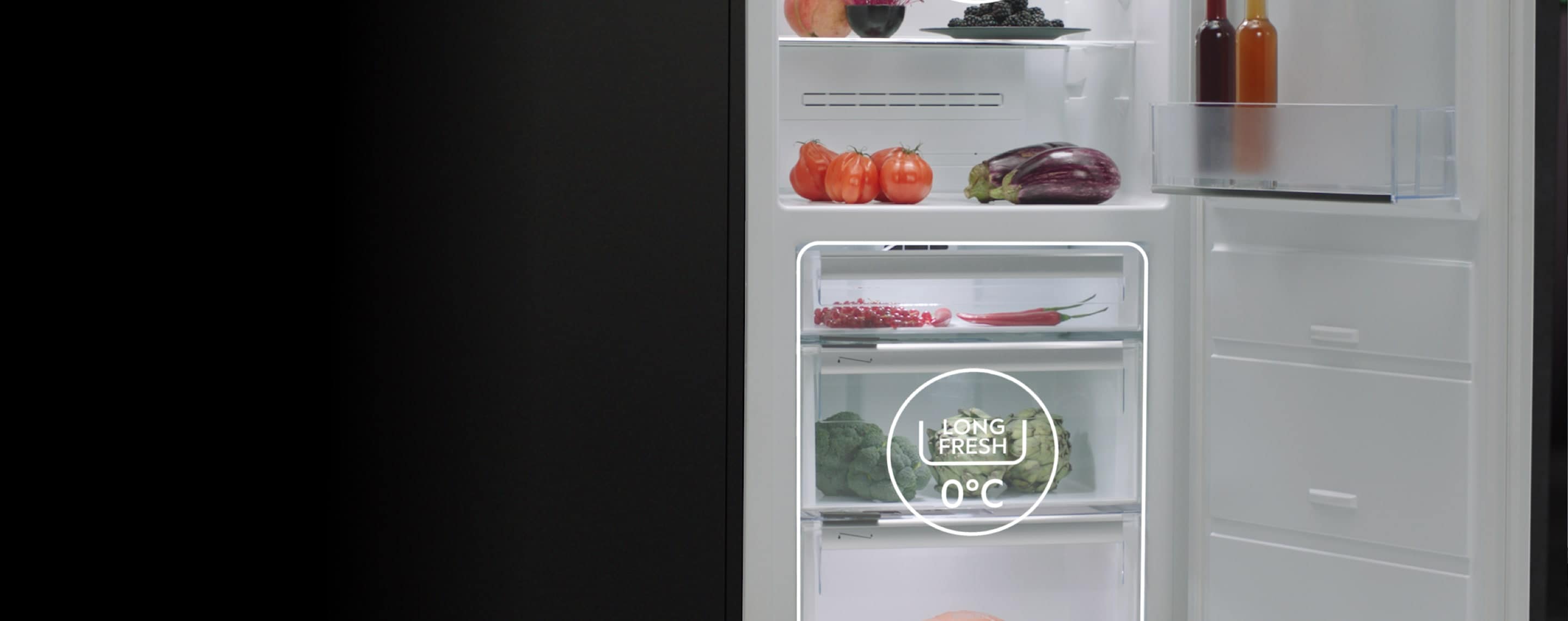Θήκες LongFresh στους 0°C, το απόλυτο περιβάλλον για την προστασία της κατάστασης των τροφίμων. Χώρος με χαμηλότερη θερμοκρασία από το υπόλοιπο ψυγείο, διατηρείται στους 0°C βαθμούς. Η κατάλληλη ζώνη για ψάρια, κρέατα ή ευαίσθητα τρόφιμα. Εξοπλισμένος με στοιχεία ελέγχου για την υγρασία, για να μην στεγνώνουν τα τρόφιμα. Για προσεκτικά επιλεγμένα φρέσκα φρούτα και λαχανικά που διατηρούν στο ακέραιο τα αρώματά τους.