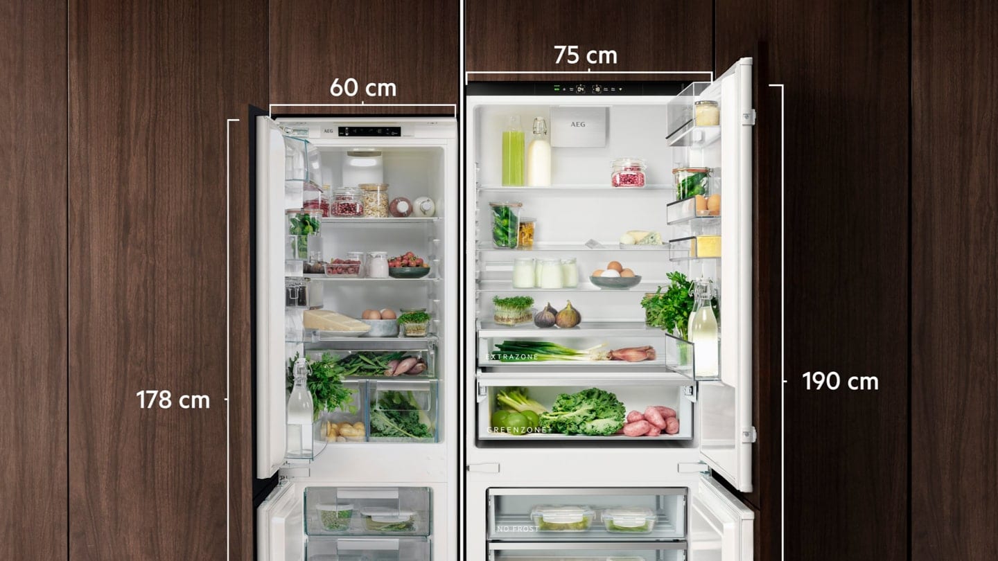 Οι εντοιχιζόμενοι ψυγειοκαταψύκτες συνήθως παρέχονται σε τυπικό μέγεθος, ώστε να χωρούν μέσα σε ντουλάπι της κουζίνας. Τα ελεύθερα μοντέλα μπορεί να ποικίλλουν ανάλογα με το ύψος και το πλάτος. Τα ειδικά μεγέθη μας κυμαίνονται από 60 έως 75 εκ. σε πλάτος και έως 190 εκ. σε ύψος, όπως ο ψυγειοκαταψύκτης MaxiSpace που παρέχει 45% περισσότερη χωρητικότητα σε σχέση με τους τυπικούς ψυγειοκαταψύκτες. Όλες οι διαστάσεις είναι διαθέσιμες στις σελίδες προϊόντων μας.