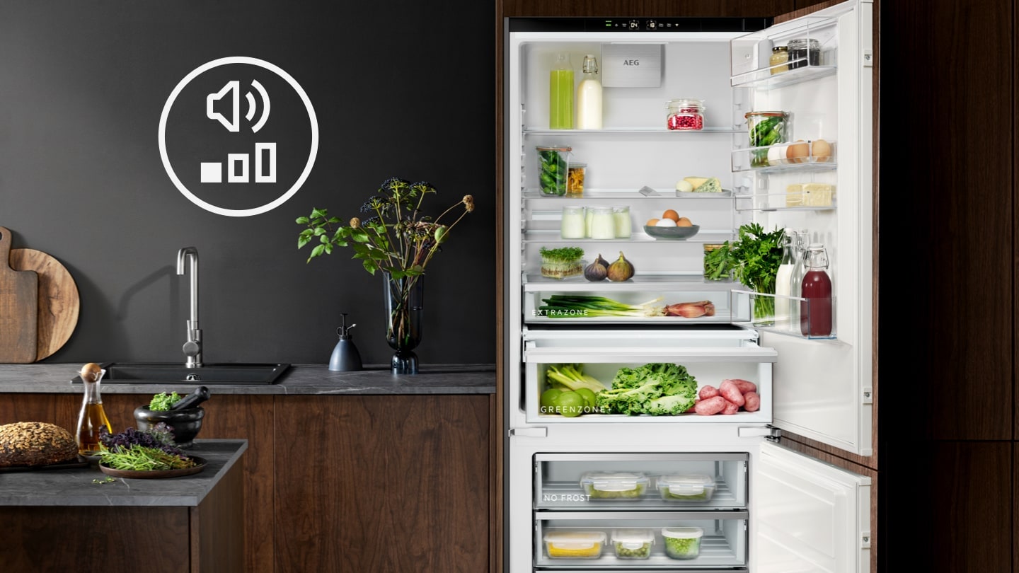 Για ένα ευχάριστο περιβάλλον στην κουζίνα με λιγότερες ενοχλήσεις από θορύβους, επιλέξτε μια συσκευή ψύξης με χαμηλή τιμή σε ντεσιμπέλ (dB). Το επίπεδο ισχύος θορύβου των ψυγειοκαταψυκτών εξαρτάται από πολλούς παράγοντες, όπως το μέγεθος, το βάρος, τους κραδασμούς, τους σωλήνες και τον αεροσυμπιεστή, που μπορεί όλα να διαφέρουν από μοντέλο σε μοντέλο. Η AEG παρέχει ψυγειοκαταψύκτες 33-35 dB (A).