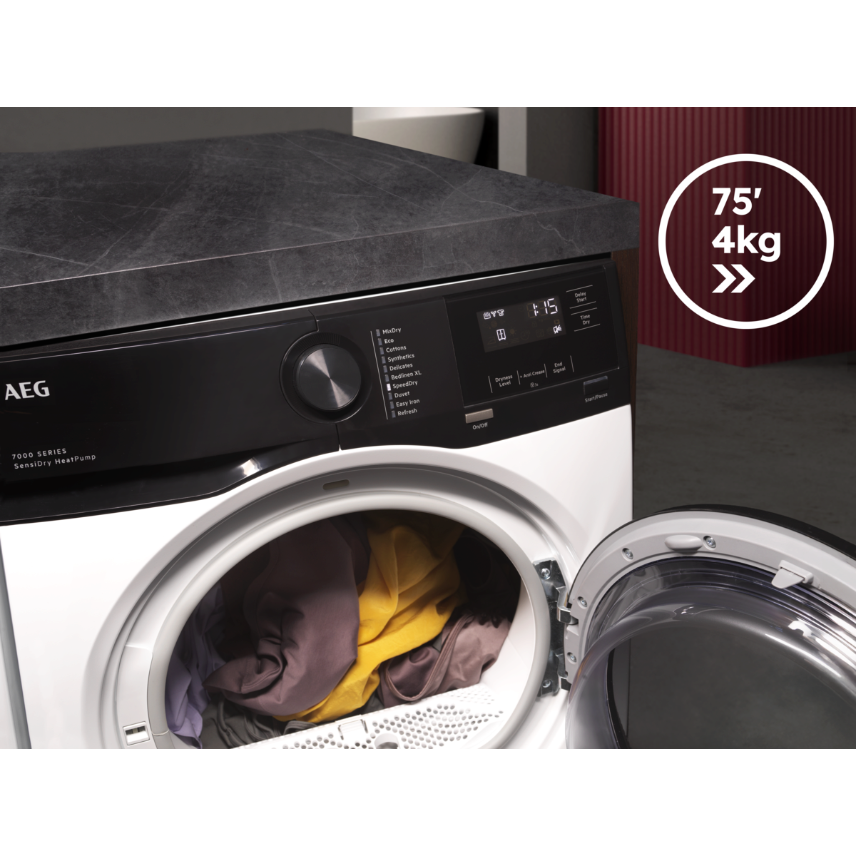 Γρήγορος κύκλος για πολυάσχολες μέρες. Στεγνώνει απαλά έως 4 κιλά σε 75 λεπτά.*