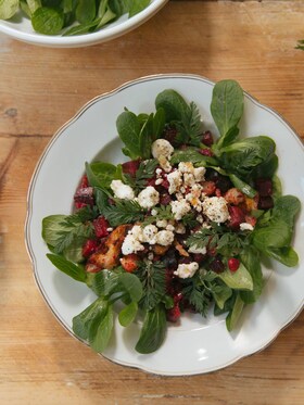 6. Βάλτε τις πρασινάδες σε ένα πιάτο, από πάνω τα ψητά λαχανικά και τα τρίμματα φέτας.